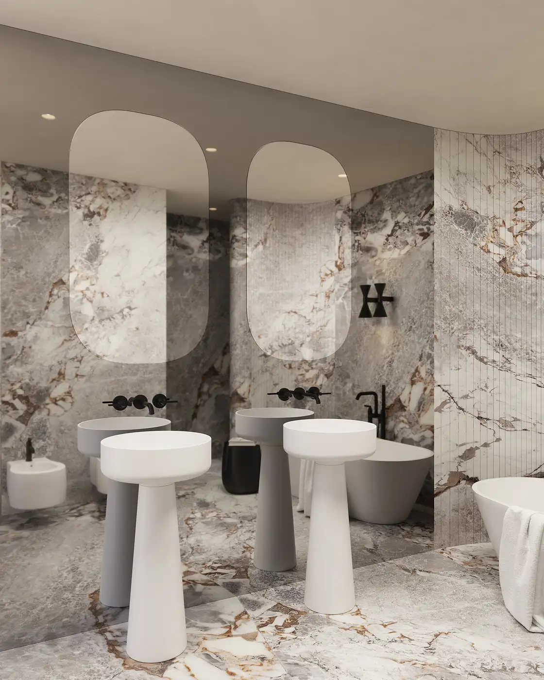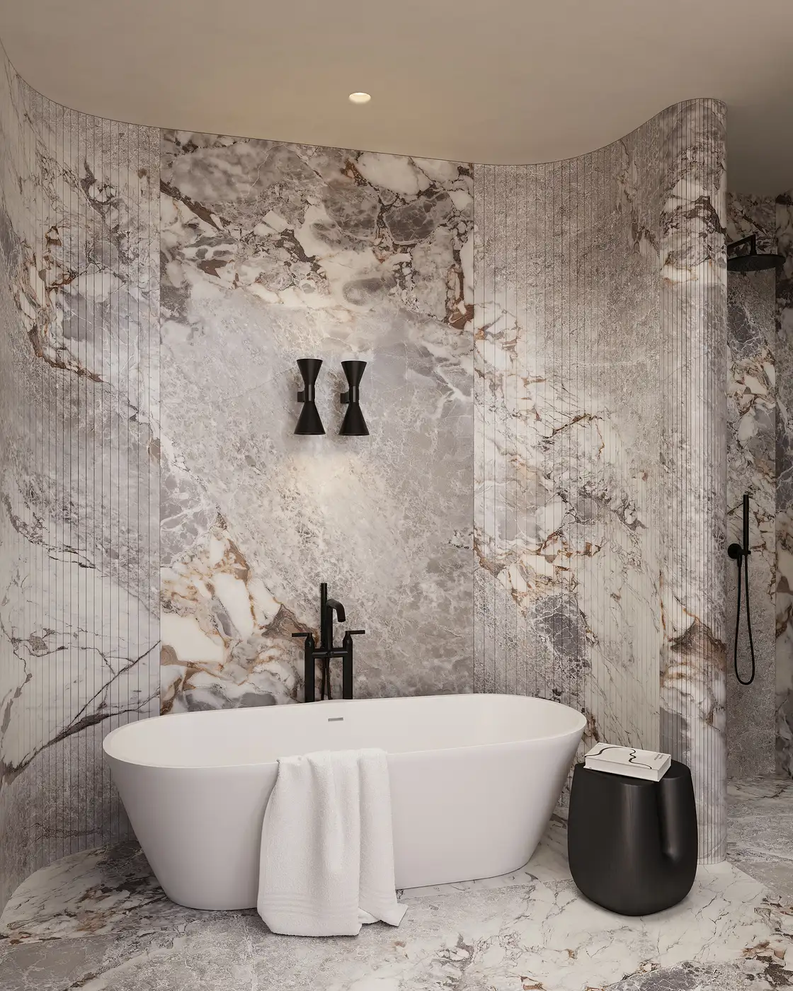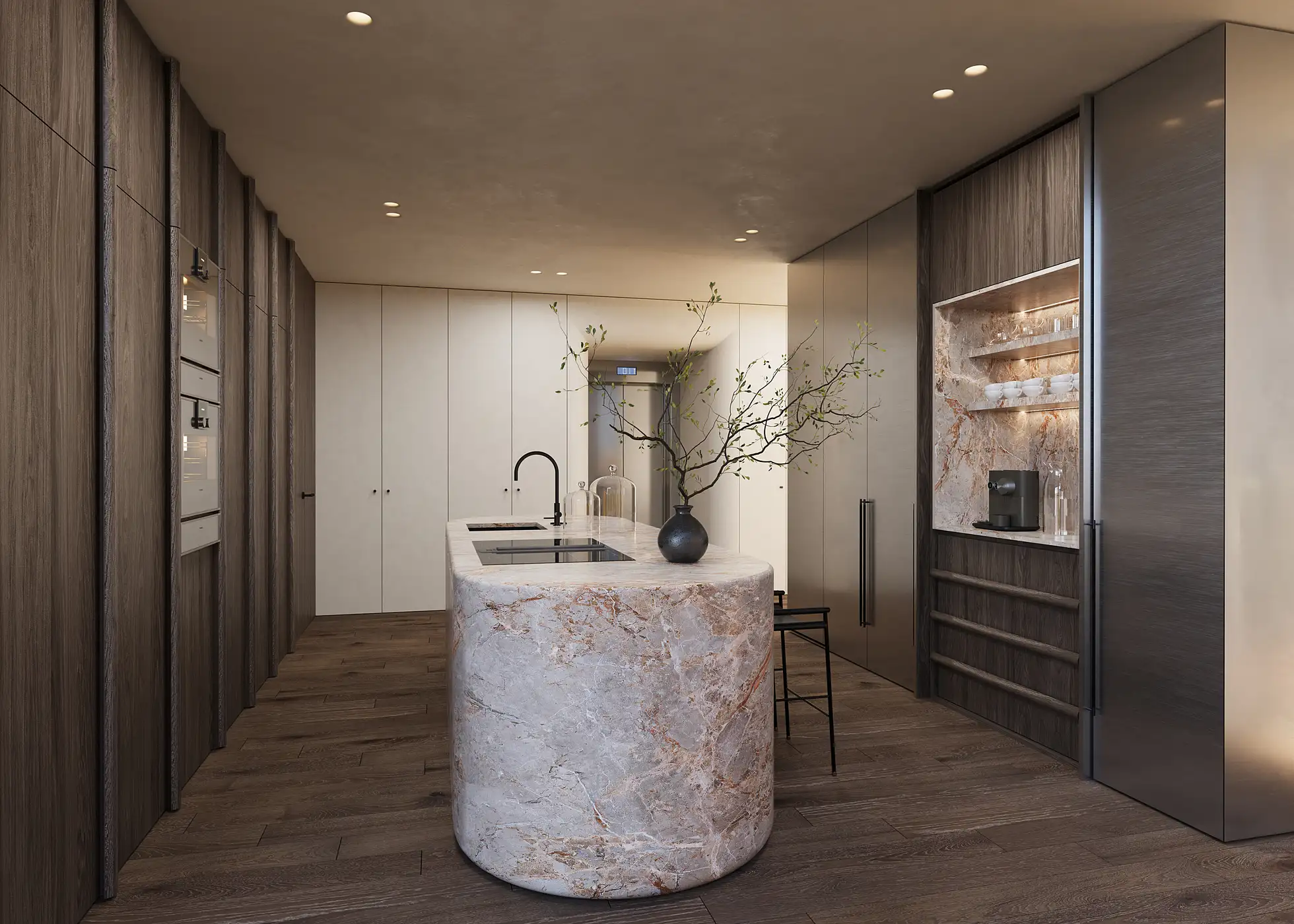 Material choices play a central role in shaping the character of the space. Natural clay, wood and marble are used in a restrained yet expressive manner, creating a sense of warmth and understated luxury. Sculptural architectural elements punctuate the interior, giving it presence and depth while remaining closely tied to function and everyday use.