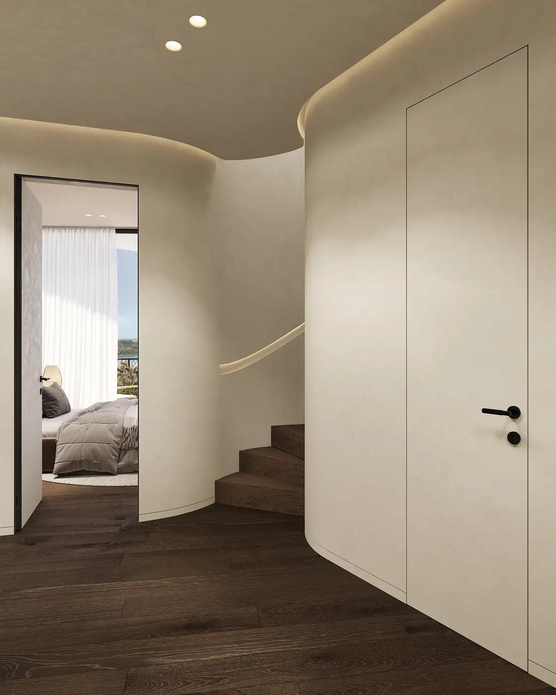 The project is defined by a clear spatial hierarchy across two levels. The upper floor, open and expressive, is conceived as a setting for social gatherings and dynamic family life — a generous, light-filled sequence framed by large glass openings and long vistas. Below, the atmosphere shifts into a more secluded and serene realm, forming an intimate private zone dedicated to rest and retreat. This deliberate spatial division reinforces the architectural logic of the building, creating a sense of order, calm and continuity throughout the interior.