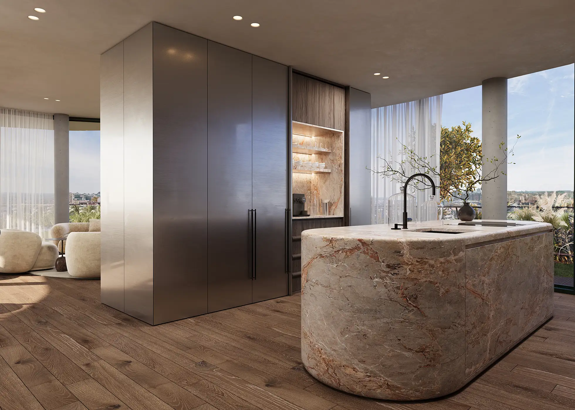 The result is an interior that feels both refined and grounded — a calm urban refuge where contemporary luxury is experienced through proportion, material, and atmosphere. More than a designed space, the penthouse becomes a place to live slowly and fully, offering a lasting sense of balance, comfort and quiet sophistication.