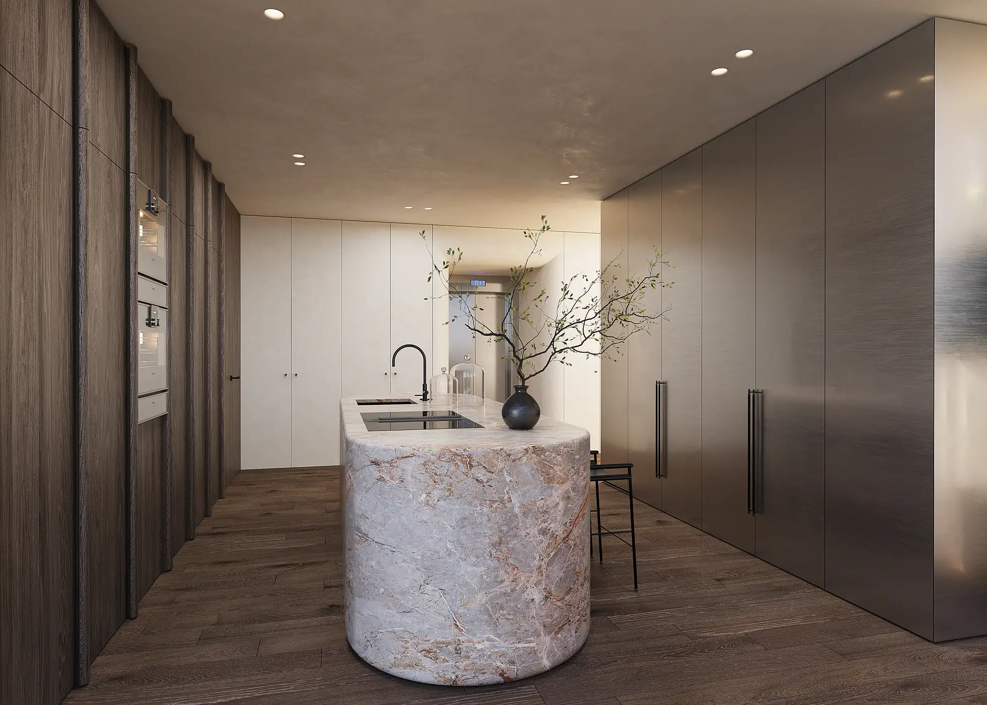 The duplex structure of the penthouse established a precise framework for the design process. Existing installations, structural constraints and carefully framed views required a high level of control and coordination to preserve spatial fluidity and coherence. Each intervention was measured and deliberate, supporting the architecture while allowing the interior to develop its own quiet identity.