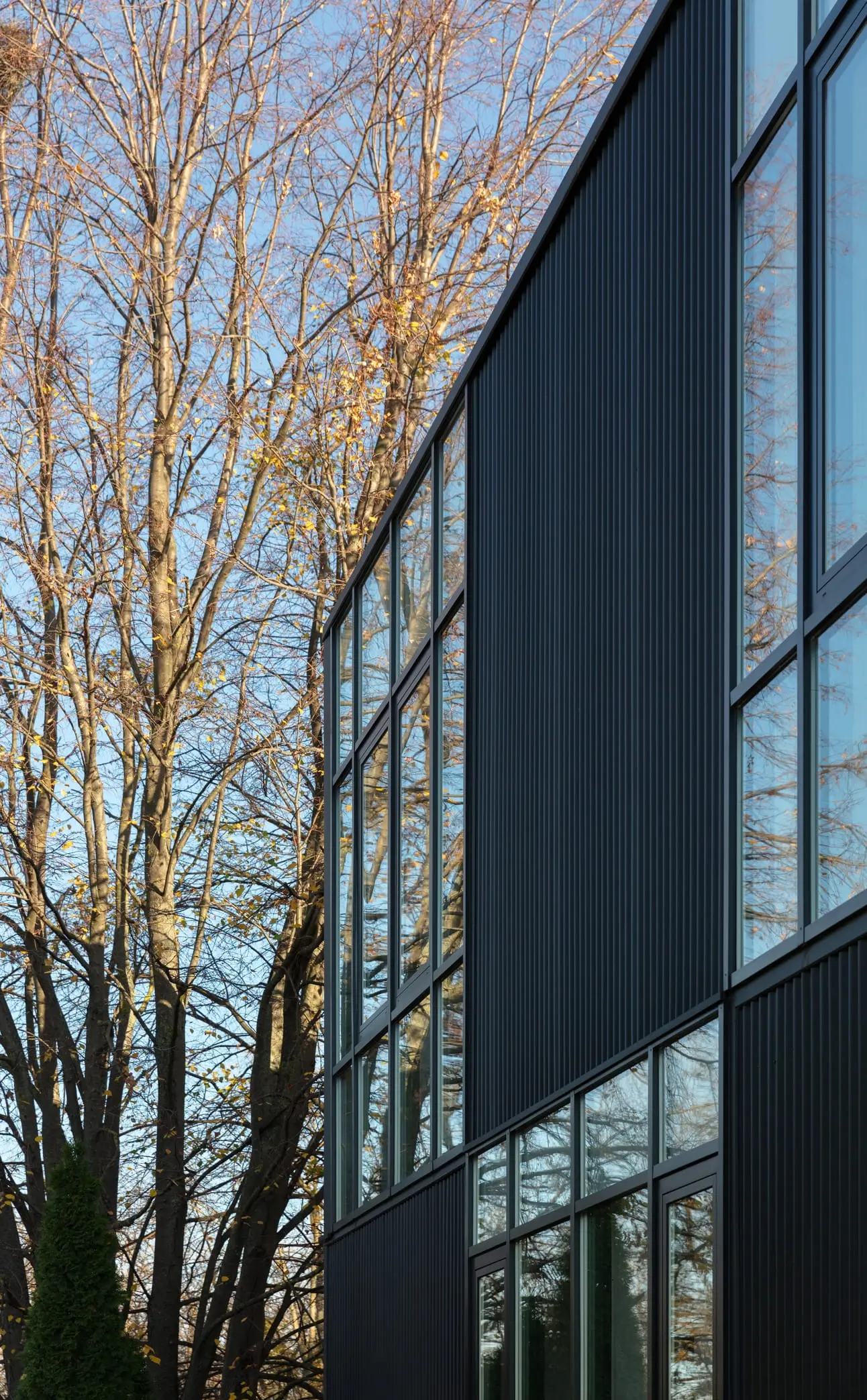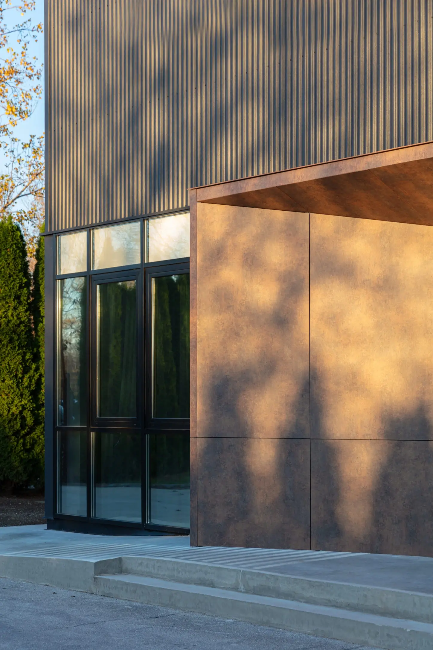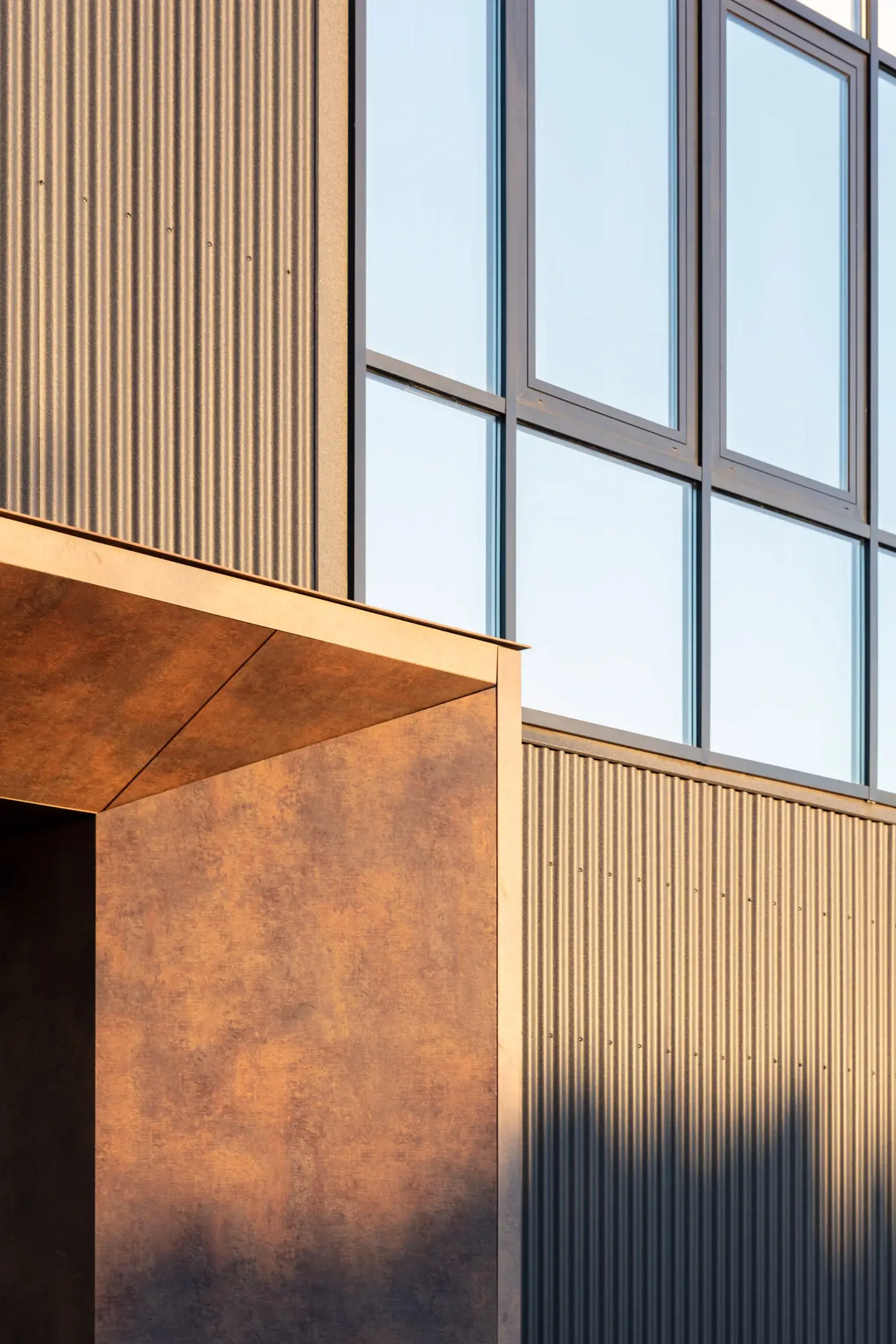 The new identity is articulated through a restrained yet expressive façade composition. An alternating rhythm of solid metal surfaces and large-format glazing introduces visual dynamism and underscores the building’s contemporary character while subtly shifting in appearance with changing daylight. A distinctive entrance canopy coated in corten metal panels marks the point of arrival and strengthens the building’s recognizability.